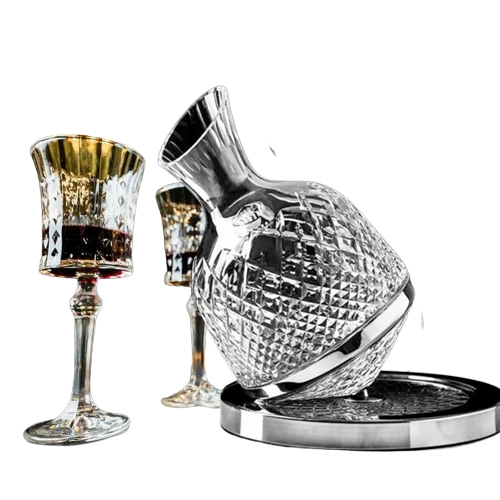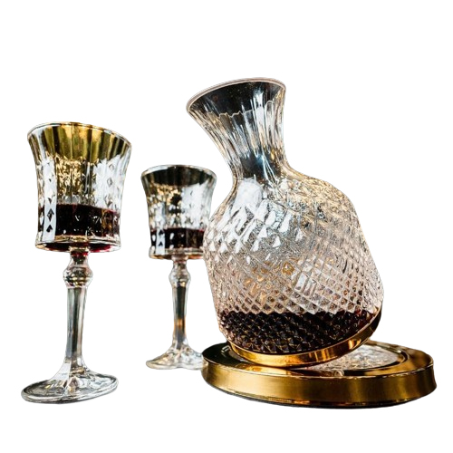 Karafa krištáľová na červené víno – rotačný podstavec + 2 poháre (zlatá/strieborná) – luxusná darčeková súprava na víno pre milovníkov elegancie a štýlového servírovania - originálny darček pre muža, priateľa, kolegu, otca na narodeniny, či iné jubileum. Set rotačnej karafy na nápoje s 2 pohármi v zlatej farbe či striebornej farbe je stvorený pre nezabudnuteľné večery vo dvojici. Po dlhom týždni si konečne sadáte k večeri, pri jemnom svetle a hudbe v pozadí. Tento elegantný set prinesie do vášho večera špeciálny nádych romantiky. Karafa nie je len funkčný doplnok, ale aj ohromujúca dekorácia, ktorá okamžite upúta pozornosť a pridá vašim stretnutiam jedinečnú atmosféru.